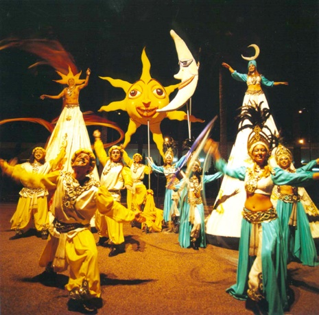 A través del teatro y la danza el montaje ofrece un lenguaje poético y festivo repleto de sugerentes imágenes, en las que los actores realizan diferentes acciones y coreografías con elementos de animación teatral, estructuras escenográficas, esculturas móviles, música y efectos visuales de pirotecnia.