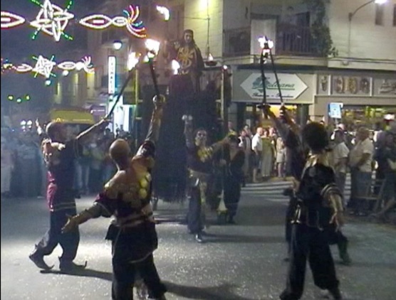 Una gran estructura móvil rodante decorada con fuego y manejada por dos actores, porta sobre ella un personaje a modo de poderoso señor feudal que lidera al grupo y que también utiliza elementos de fuego y pirotecnia. Acompaña a los actores una estructura rodante móvil, con equipo de sonido para ambientación musical, con una banda sonora apropiada al carácter medieval del evento.
