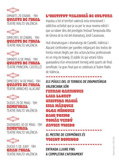 Ocho dramaturgas y dramaturgos de Castellón, Valencia y Alicante se enfrentan por parejas mediante dos textos de treinta minutos leídos por dos actores/actrices profesionales en un ring de boxeo. El público es quien votará la obra ganadora de un emocionante torneo con cuartos de final, semifinales y la gran final que se celebrará al Teatre Rialto de València.